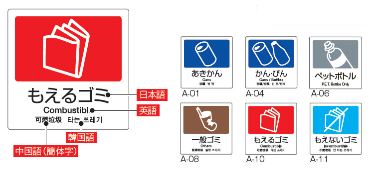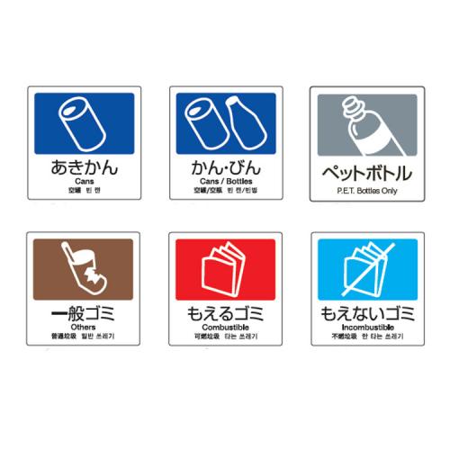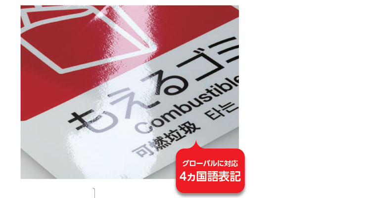 分別回収に欠かせない便利な表示シール。グローバルに対応した4ヵ国語表示です。