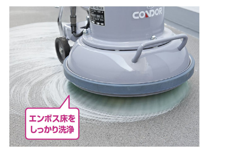 エンボス床の汚れをしっかり洗浄できる真鍮トーロンブラシ。