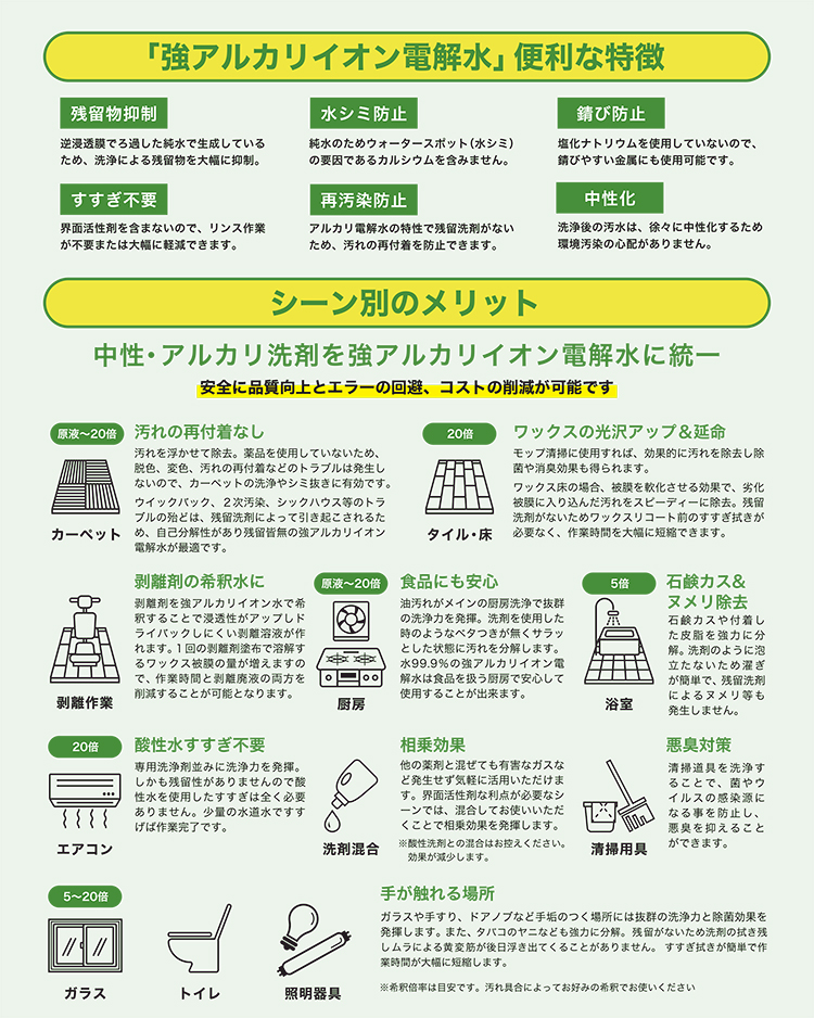 人・環境・建物にやさしいアルカリ電解水。
