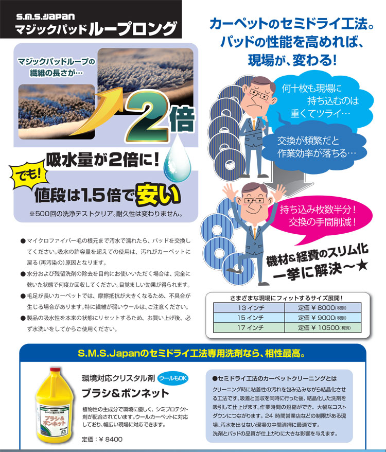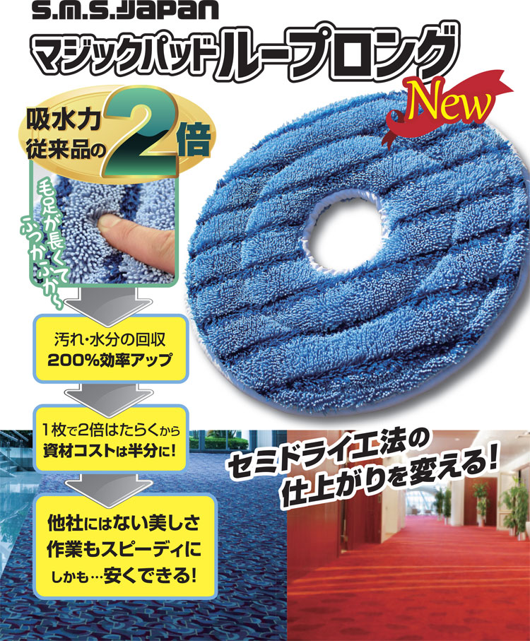 マジックパッドループタイプのロングタイプ。 吸水力が従来品の2倍!!だから、現場へ持ち込み枚数が軽減して、交換の手間も削減できます。