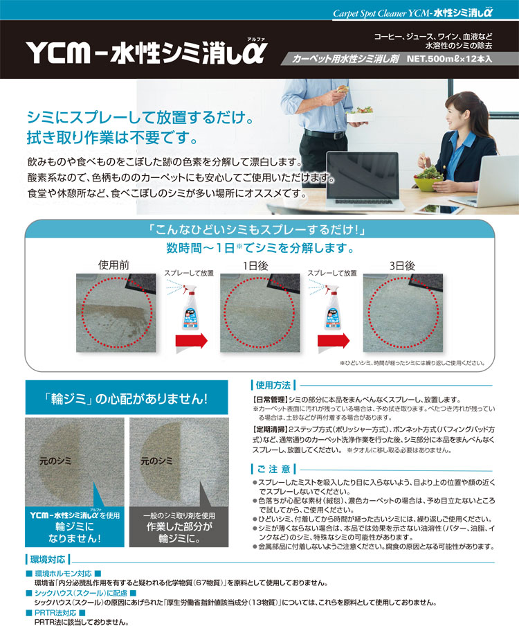 スプレーして放置するだけで、コーヒー、ジュース、ワインなどの水性のシミを分解、漂白します。