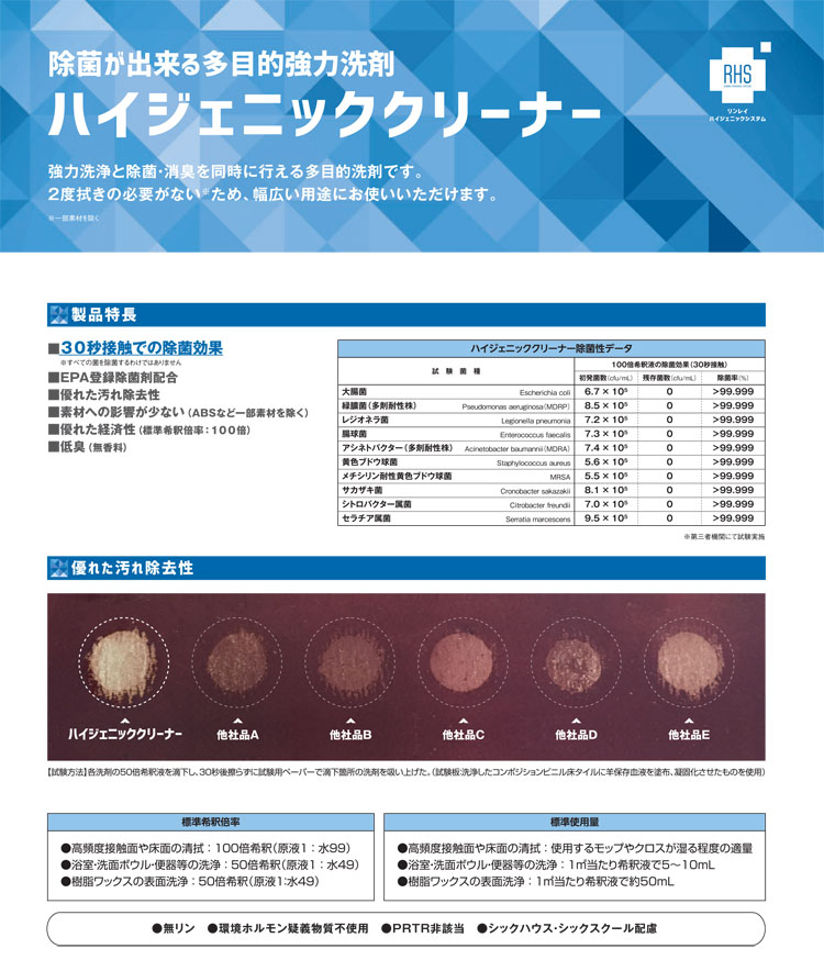 | 4L | 50~100倍 | 約11(@25℃) | 約3(mPa・s、@25℃) | 水、ビルダー、金属封鎖剤、非イオン系界面活性剤、両性界面活性剤、除菌剤、染料 |
