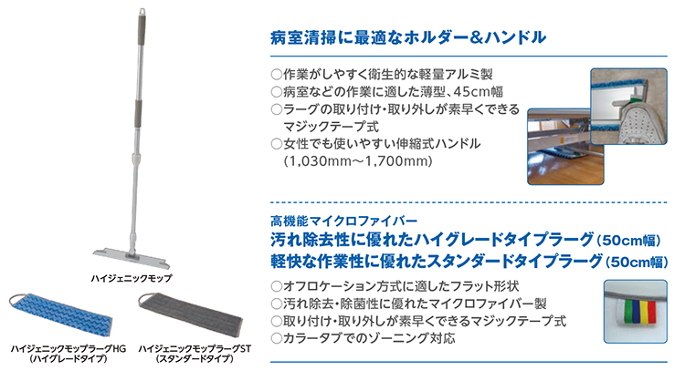 汚れ除去性に優れたハイグレードタイプと軽快な作業性に優れたスタンダードタイプ。カラータブでのゾーニング対応。