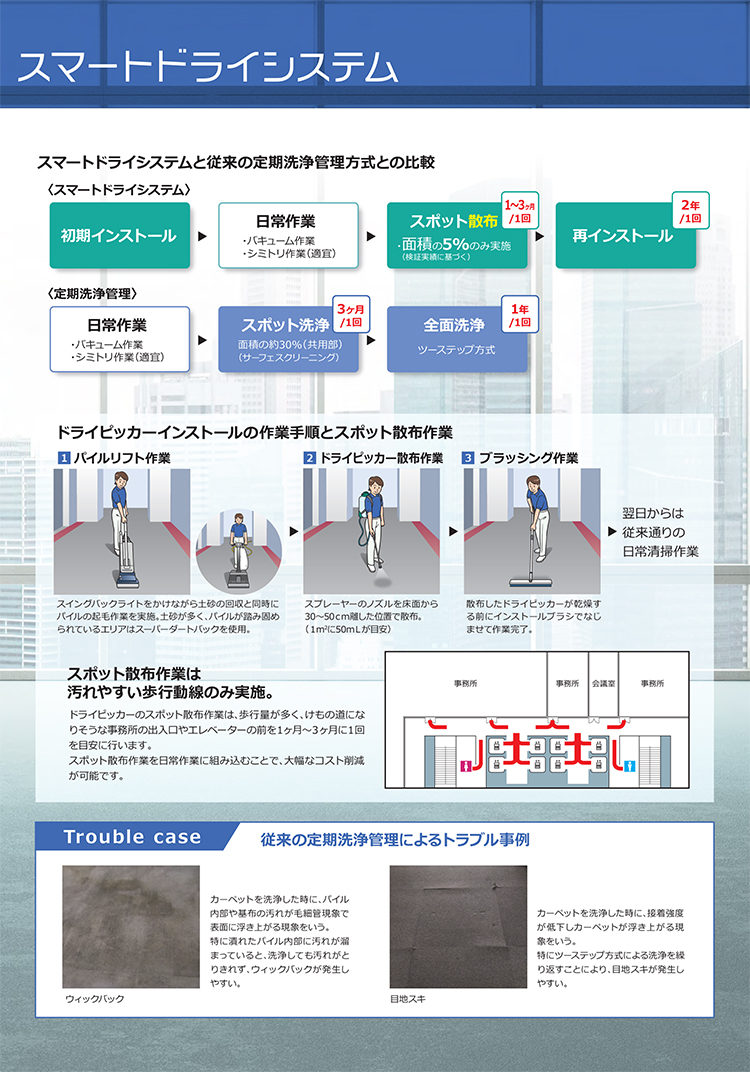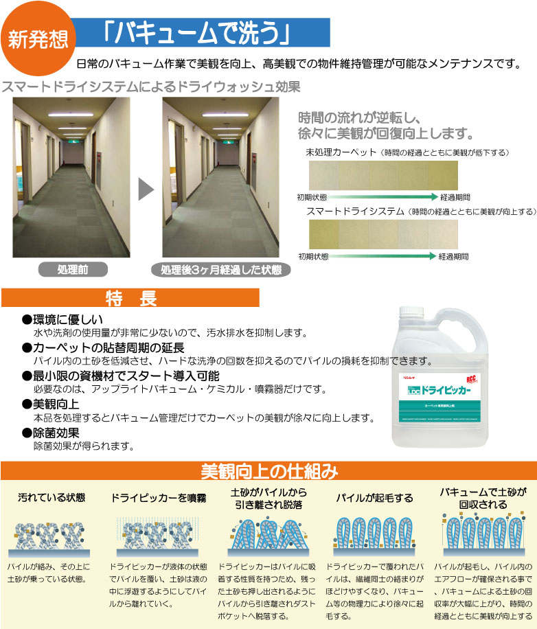 ・本品を処理するとバキューム管理だけでカーペットの美観が徐々に向上します。