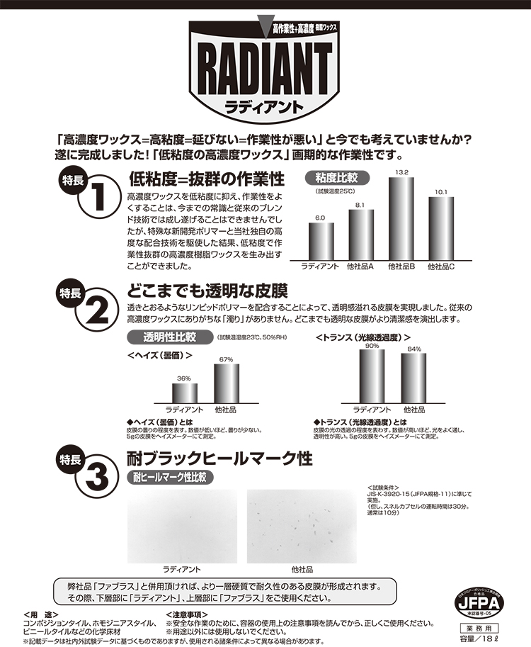 | 18L | 800~1,000m2 | 7.9 ± 1.0 | 5.0 ± 2.0 mPa・s | 約25±2 (wt%、105℃/4時間) | 水 金属架橋型アクリル系コポリマー ポリオレフィン アルカリ可溶性樹脂 可塑剤(リン系) 融合剤(カルビトール系) レベリング助剤(フッ素系) 消泡剤、他 |