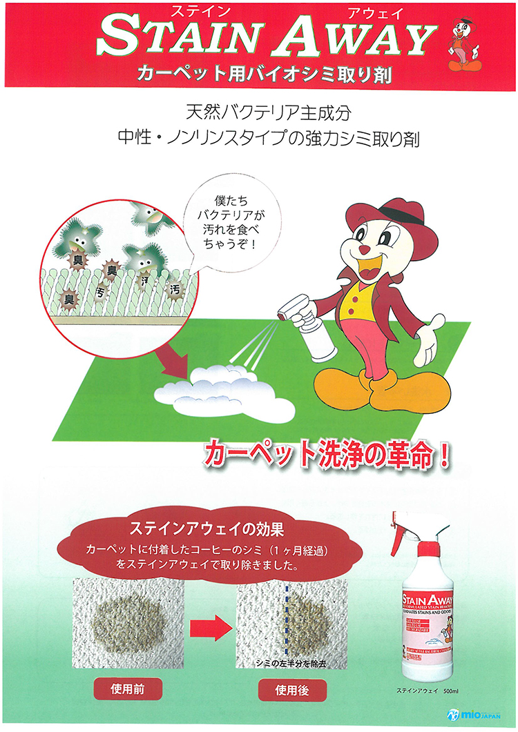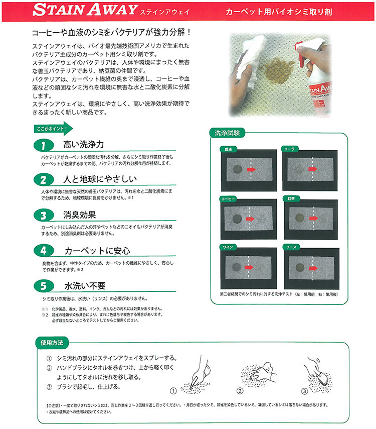 ステインアウェイはカーペットに付着したコーヒー、紅茶ソース、醤油、血液、嘔吐物、ペットのオシッコなどのシミをバイオの力で強力に落とすカーペットシミ取り剤です。