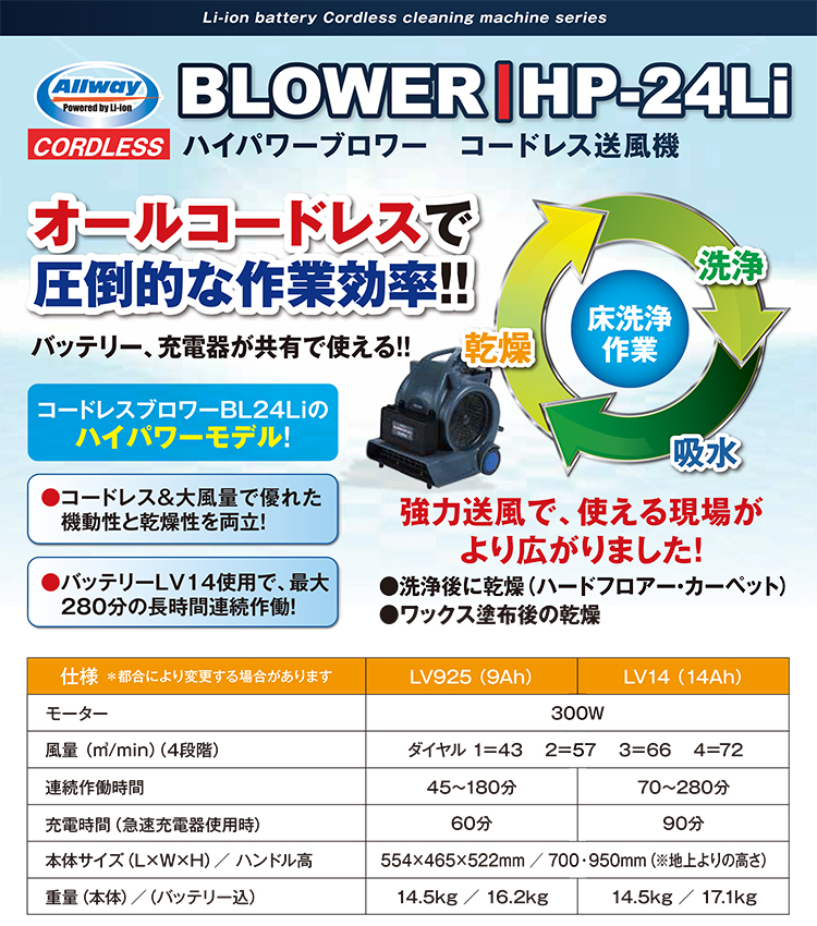 ●連続稼動最大280分!(※バッテリーLV14使用時)●風量は従来比5倍(※BL-24Liの最大風量との比較)。4段階切替可能。