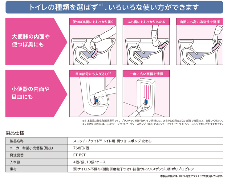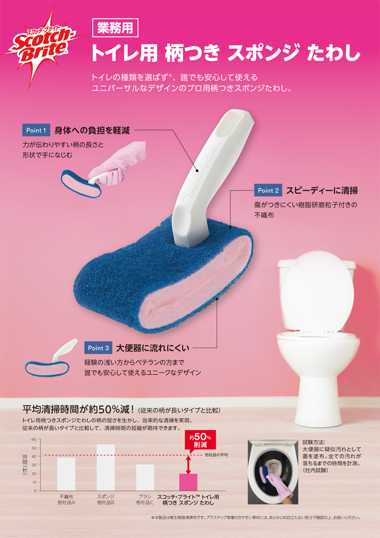 トイレの種類を選ばず、誰でも安心して使えるユニバーサルなデザインのプロ用柄付きスポンジたわし