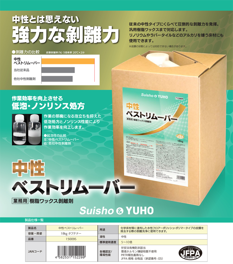 アルカリを嫌う床材(リノリウムやラバータイルなど)への剝離作業に最適な中性剝離剤です。中性ながら強力な剝離剤で、床材へのダメージを抑えつつ、効率的に剝離作業を行えます。