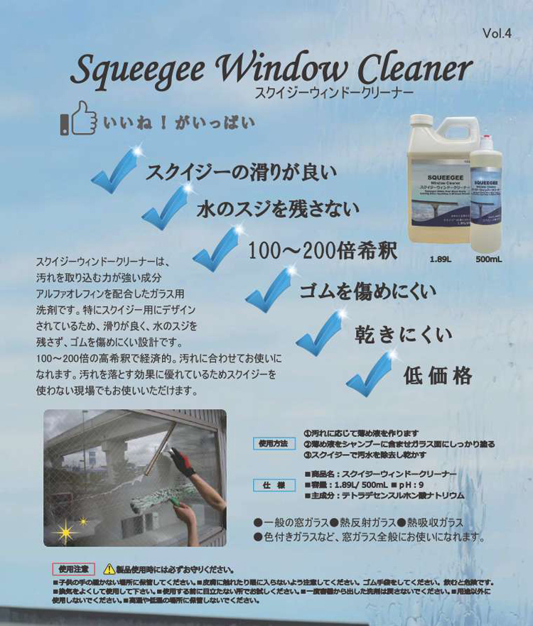 水の筋を残さず汚れを落とし、ガラスの輝きを取り戻すよう化学的にデザインされた製品。スクイジーの滑りも良好で、高希釈使用が可能のため経済的。