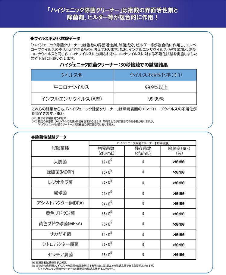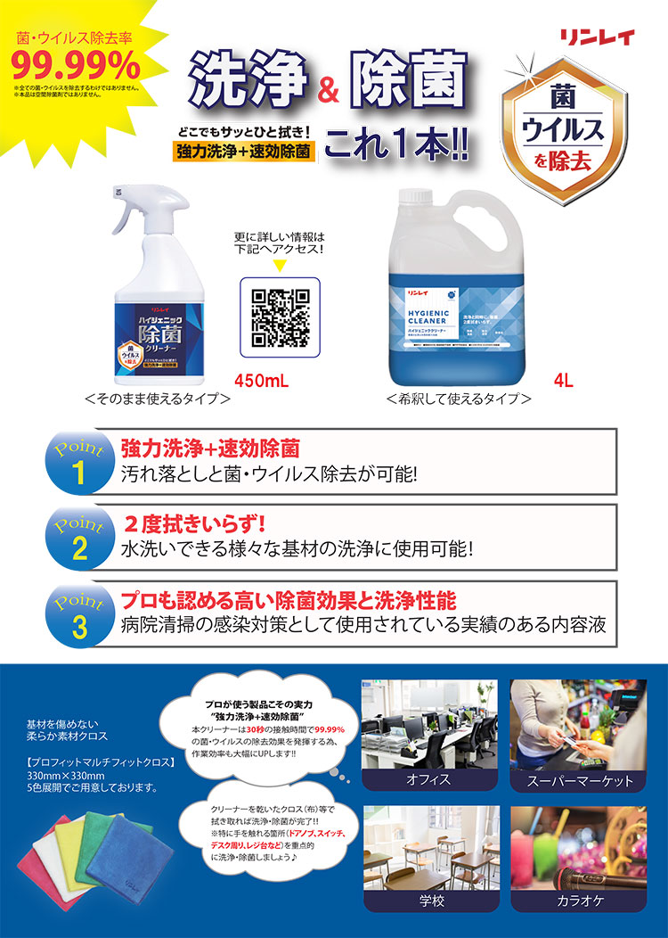 強力洗浄と除菌・消臭を同時に行える多目的洗剤。2度拭きの必要がないため幅広い用途に使用可能。(ABSなど一部素材を除く)