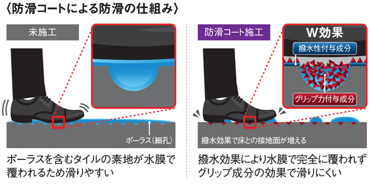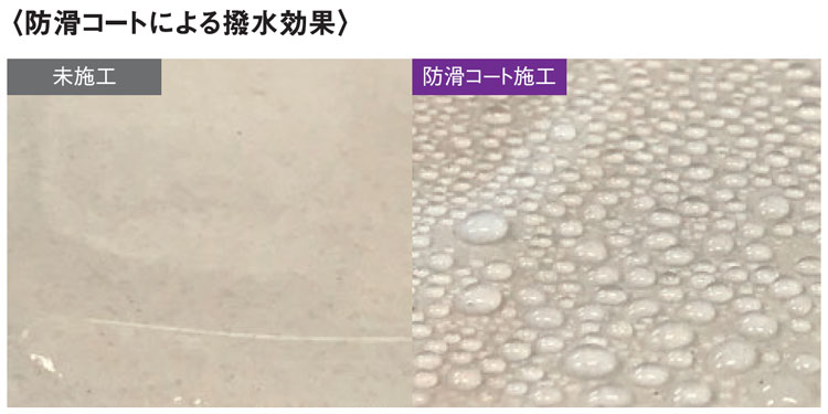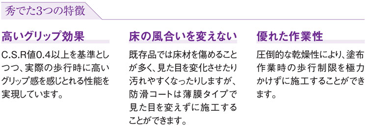 床材の風合いを変えることなく高いグリップ性を実現し、乾燥性も良く歩行制限を極力かけずに施工可能。