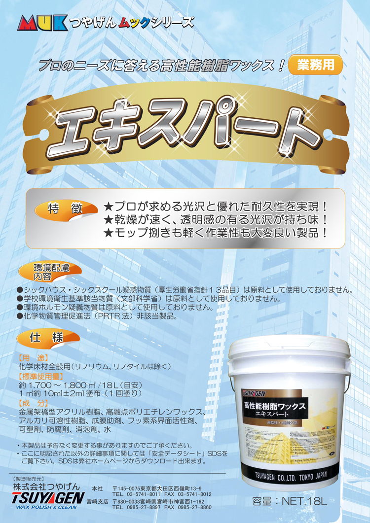 | 18L | 約1800m2/18L | 8~9(@25℃) | 約22% | 金属架橋型アクリル樹脂、高融点ポリエチレンワックス、アルカリ可溶性樹脂、成膜助剤、可塑剤、フッ素系界面活性剤、防腐剤、消泡剤、水 |