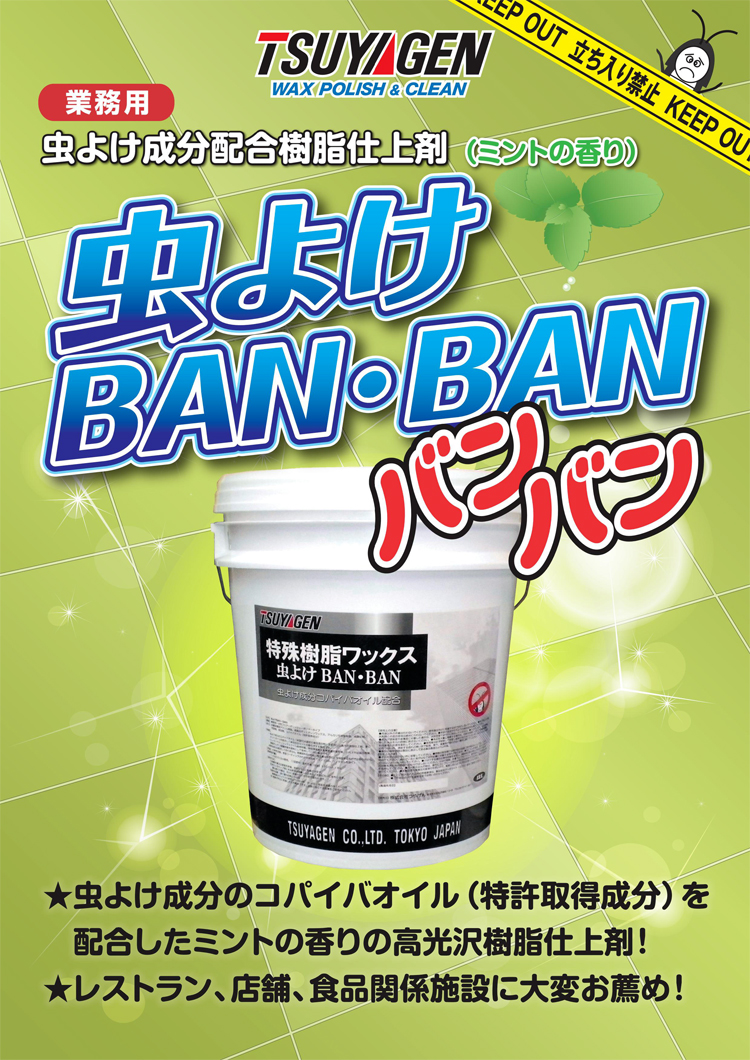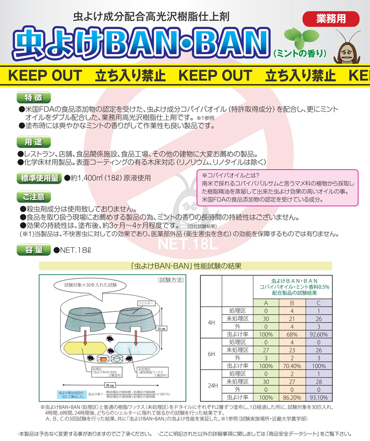 米国FDA(食品医薬品局)から食品添加物の認定を受けた虫よけ成分のコパイバオイルを配合した樹脂仕上剤。ミントの香りがして作業性も良好な製品です。レストラン、食品関係施設、店舗等に特にお勧めです。
