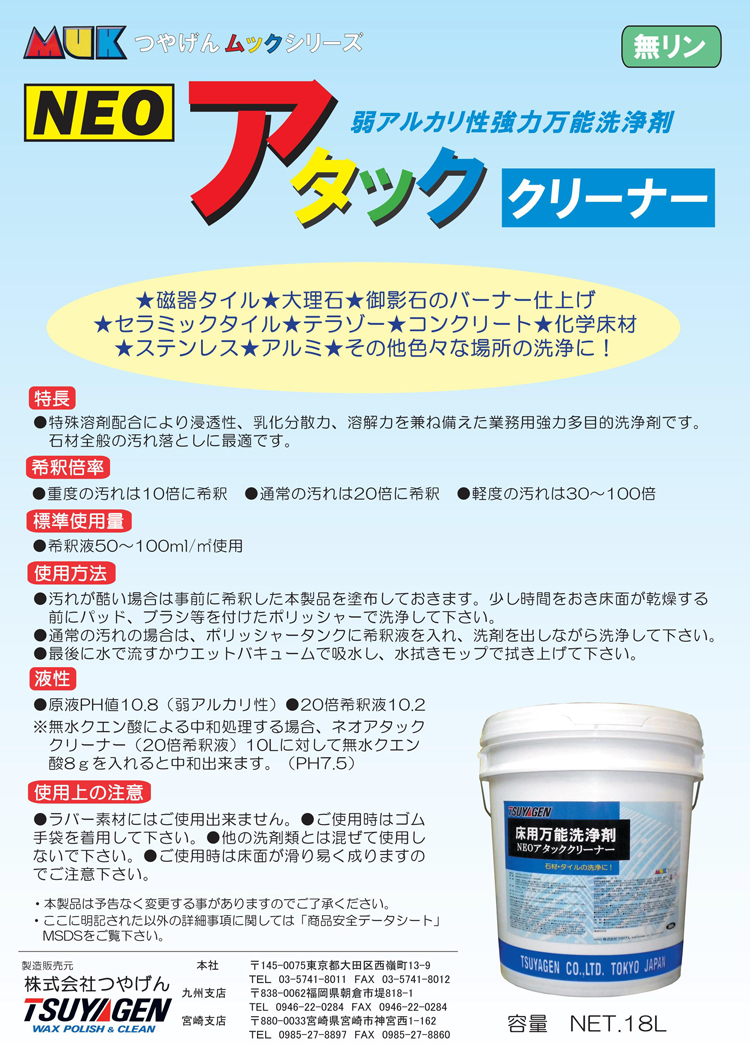 つやげん 石材、磁器タイルの洗浄にお勧め ネオアタッククリーナー 18L