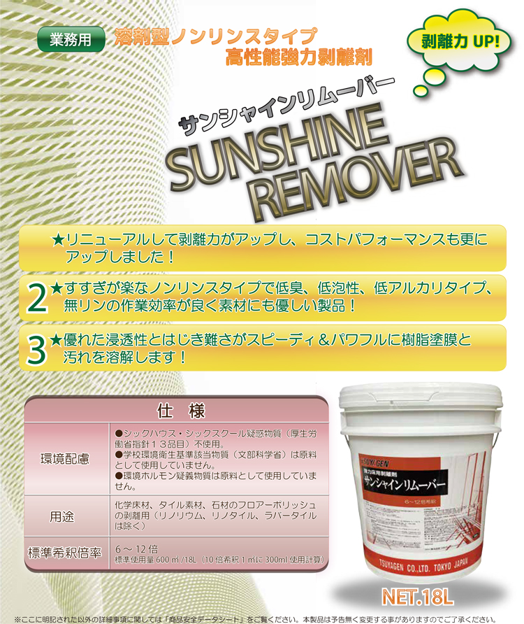 つやげん 低臭タイプのノンリンス剥離剤! サンシャインリムーバー 18L