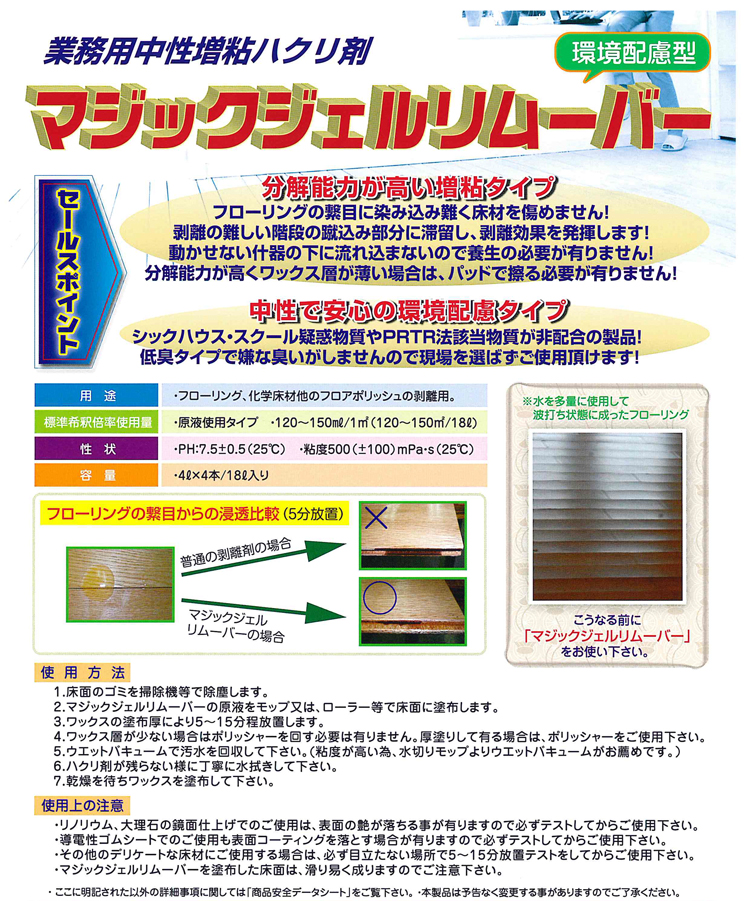 用途:フローリング、化学床材他のフロアポリッシュの剥離用。