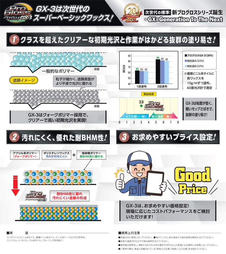 | 18L | 1,200㎡~1,800㎡(1回塗り)/18L | 8.2(25℃) | 約2.9 (mP・s、25℃) | 約20 (wt%、105℃/4時間) | 水 アクリル系樹脂エマルション 高融点ポリエチレンワックスエマルション 可塑剤 アルカリ可溶性樹脂 レベリング剤 防腐剤 消泡剤 水 |