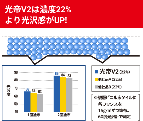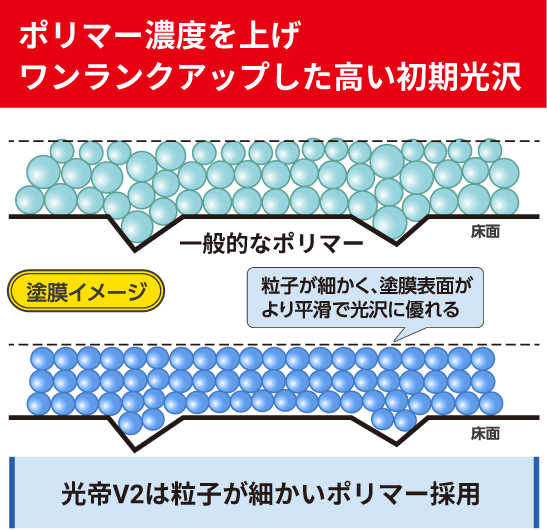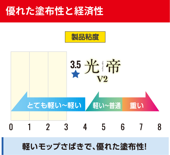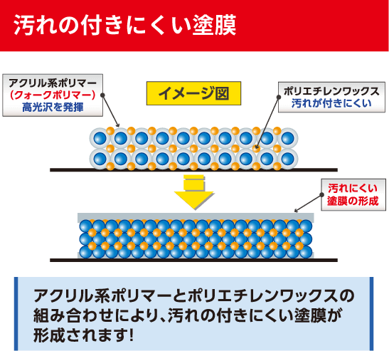 | 18L | 1200~1800m2(1回塗り) | 8.1 | 3.4mm2/s | 約22wt% | アクリル系樹脂エマルジョン、高融点ポリエチレンワックスエマルション、可塑剤、アルカリ可溶性樹脂、レベリング剤、防腐剤、消泡剤、水 |