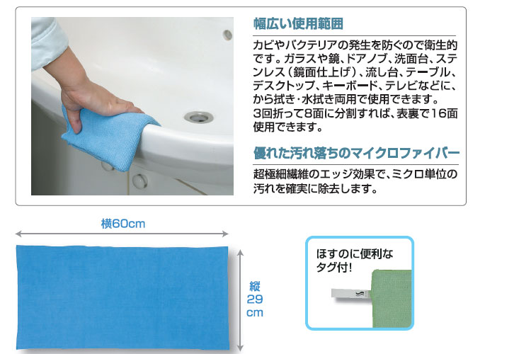 髪の毛の1/100の超極細繊維がミクロ単位の汚れを除去!繊維の断面が鋭角なくさび状になっており保水・吸水性・排水・乾燥性に優れます