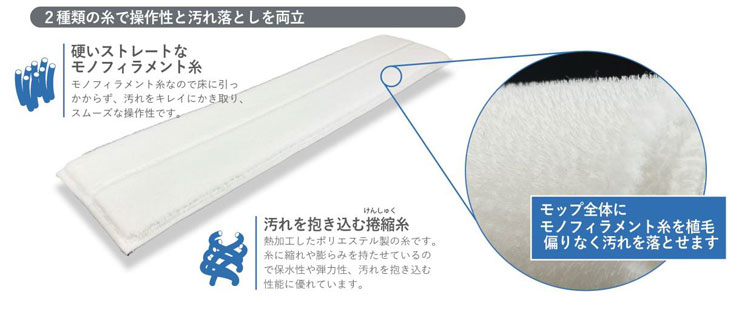 ・硬いモノフィラメント糸は、床材に引っ掛からずに汚れをかき取ることができます。・捲縮糸は保水性や弾力性に優れ、汚れをしっかり抱き込みます。