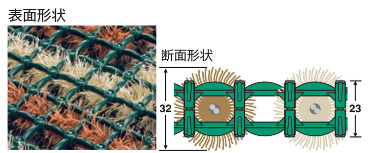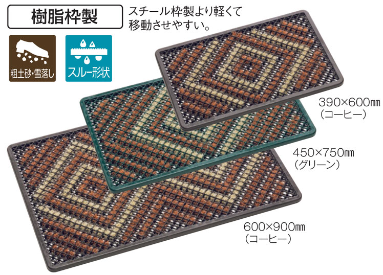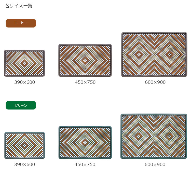 | 360×600mm 450×750mm 600×900mm | 約32mm | グリーン コーヒー | 360×600mm:約1.1kg 450×750mm:約1.5kg 600×900mm:約2.2kg | ベース:ポリエチレン ブラシ:ポリプロピレン |