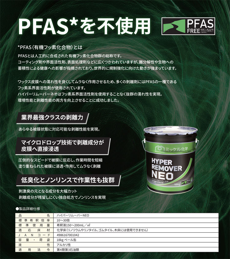 ワックス皮膜への濡れ性を良くしてムラなく作用させるため、多くの剝離剤にはPFASの一種であるフッ素系界面活性剤が使用されています。