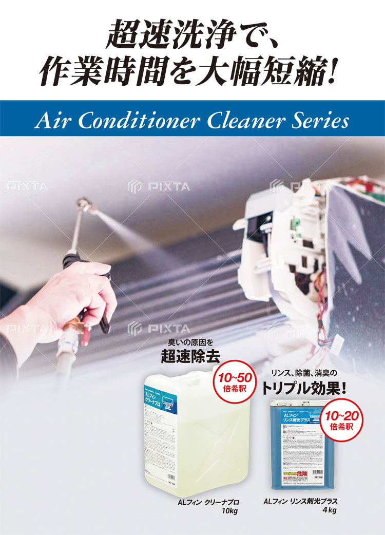 洗浄後のアルカリ成分を素早く中和し、アルミフィンの腐食を防止するリンス剤です。水よりも時短、節水になるだけでなく、ビタミン系光触媒配合で、除菌消臭効果が続きます。