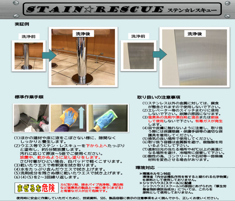 シュウ酸効果で頑固なさび・くもりを強力に落とします。ウエスまたはスポンジで塗って拭き取るだけでご利用可能です。また、希釈してご使用できます。