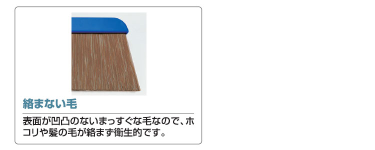 ホーキの毛が、ポリエステルで表面が凹凸のないまっすぐな毛なので、ホコリや髪の毛が絡まず衛生的です。