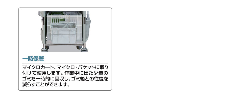 マイクロカート(別売)・マイクロバケット(別売)に取り付けて使用します。作業中に出た少量のゴミを一時的に回収し、ゴミ箱との往復を減らすことができます。