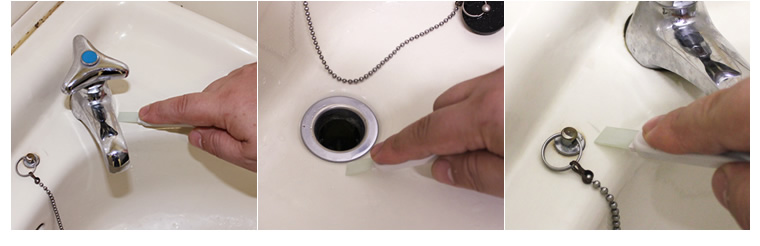 特殊な先端樹脂が陶器の黒ずみや水アカなどをこすり落とします。