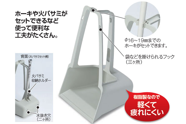 用途に合わせて選べる豊富なラインナップのチリトリシリーズ。ホーキや火バサミがセットできるなど、使って便利な工夫がたくさん。ホーキがセットできます。小物や袋が掛けられるフック有り。