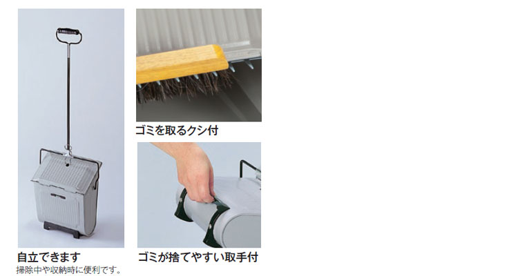 床面にフィットするゴムや、ホーキに付いたゴミを取るクシのついた使いやすい自立タイプのチリトリ。
