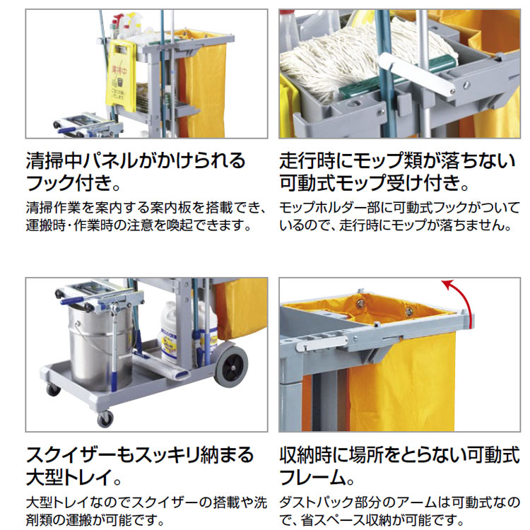 大型の商業・公共施設にご使用頂ける軽量設計の樹脂製カートです。ダストパック部分のアームは可動式なので省スペース収納が可能です。