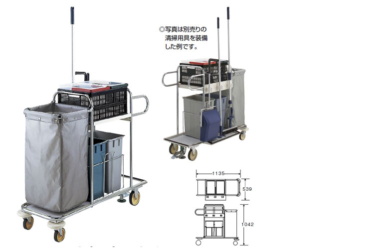 大型の商業・公共施設に最適な大容量の清掃道具を搭載可能なカートです。コンテナが傾けられるので収納物の出し入れがスムーズに行えます。足で踏むだけでブレーキがかけられ、作業が安全に行えます。