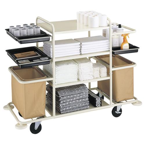 こまごまとした備品もまとめて運搬できるトレー付きワゴンです。ホテルのリネン・浴衣・カバー、備品類の補充、回収に最適です。