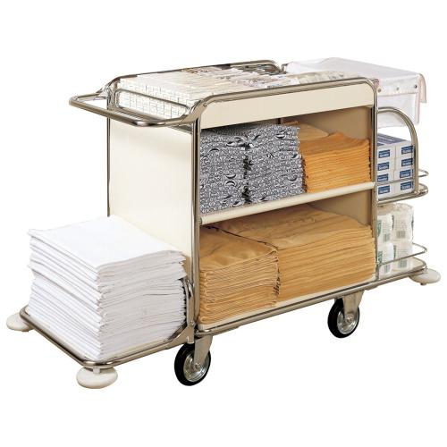 大変丈夫なスチール製の、大容量総合補充用ワゴンです。大規模ホテルのリネン・浴衣・カバー、備品類の補充などに最適です。底部は肉厚のフレームを使用し、高い耐久性を発揮します。狭いスペースでもすっきり収まるように、補助ハンドル、シックストック部は上部に折りたためる機構を採用しています。