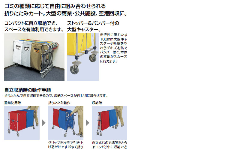 大型商業・公共施設、空港回収に最適な、ゴミの種類に応じて自由に組み合わせられる折りたたみカートのフレームです。コンパクトに自立収納でき、スペースを有効利用出来ます。