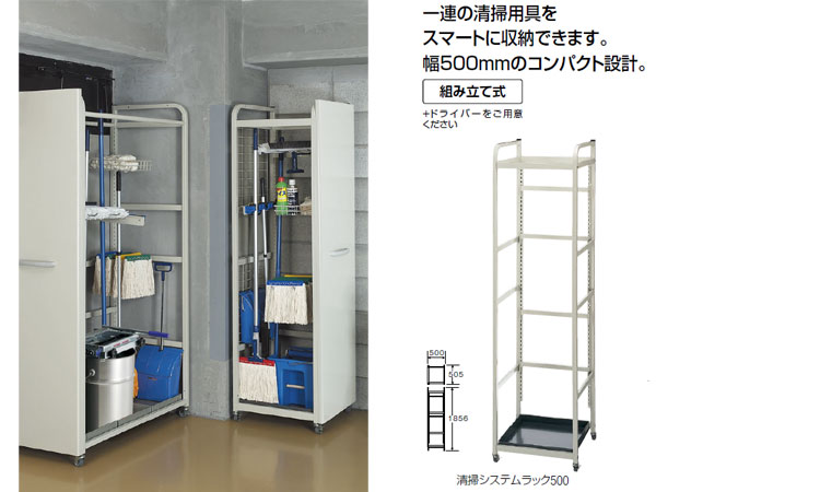 一連の清掃用具をスマートに収納できます。幅500のコンパクト設計です。収納用品に合わせて様々なアイテムが装備可能です。アイテムは全て別売になります。
