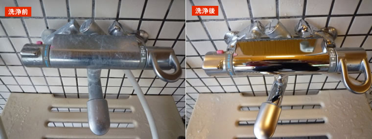 まずはカランの水垢です。家庭用のスポンジでもかんたんに落とすことができます。