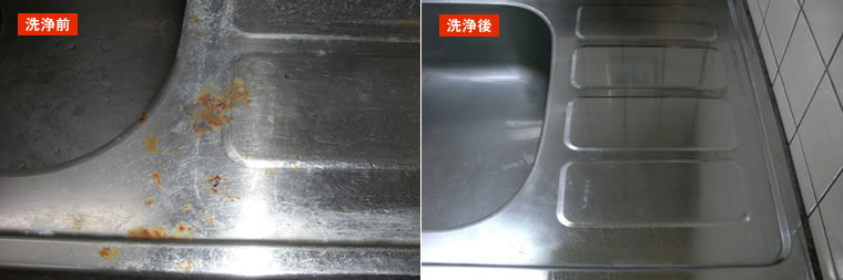 キッチンのステンレスについたサビです。ふつうなら諦めるしかない、といった雰囲気ですが、EZクリーンならなんとかなります。このケースは部分的に腐食が進んでいたので、完全には落とせませんでしたが、それでもここまで回復しました。