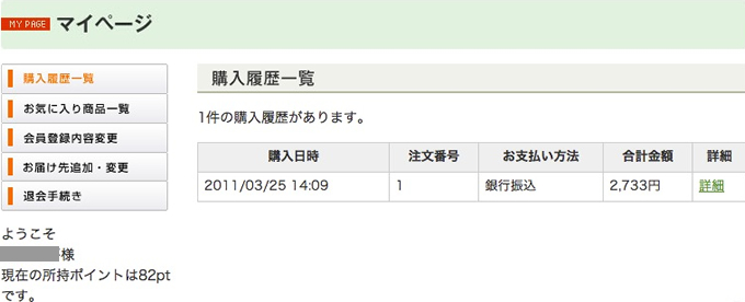 購入した商品名と金額はもちろんのこと、購入日時、お支払い方法、お届け先も参照できます。